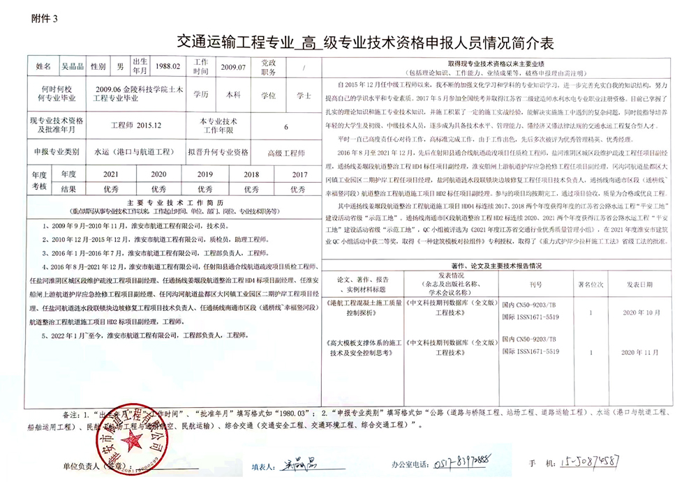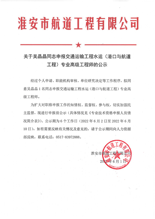 關(guān)于吳晶晶同志申報交通運輸工程水運(港口與航道工程)專(zhuān)業(yè)高級工程師的公示